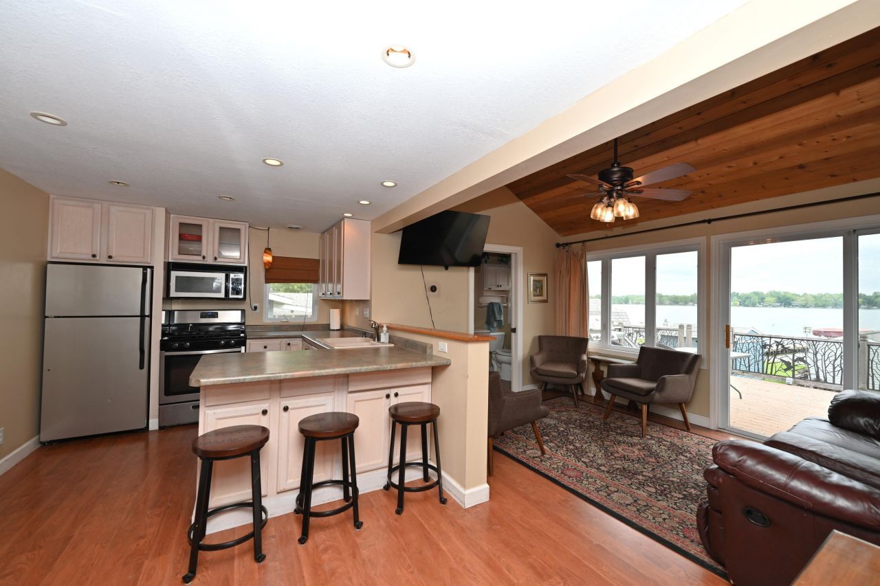 Lake Life Awaits! Savor the stunning views of Bruce Lake from your spacious deck. Countless memories waiting to be created with BBQs, bonfires, yard games, boat rides, fishing and more! This charming 3-5 bedroom home is filled with character. The living room exudes a cozy cabin ambiance, featuring a cathedral ceiling and a breathtaking view of the lake. On one side of the home, you will find a primary suite that includes a bedroom, a bathroom, and your very own living room/sunroom. The opposite side of the home boasts a kitchen, dining room or sitting area, bathroom, two bedrooms, and a spiral staircase leading to a loft where you will find three twin beds, Additionally, there are two walk-out basements equipped with sleeping arrangements, laundry facilities, and bathrooms. Experience the perfect blend of comfort and nature!